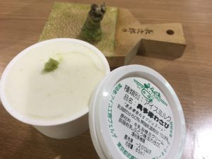 わさびのツブツブが入った「奥多摩わさびアイス」に擦ったわさびをトッピングするとさらに美味しいです。