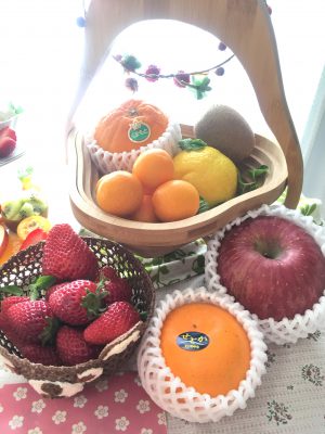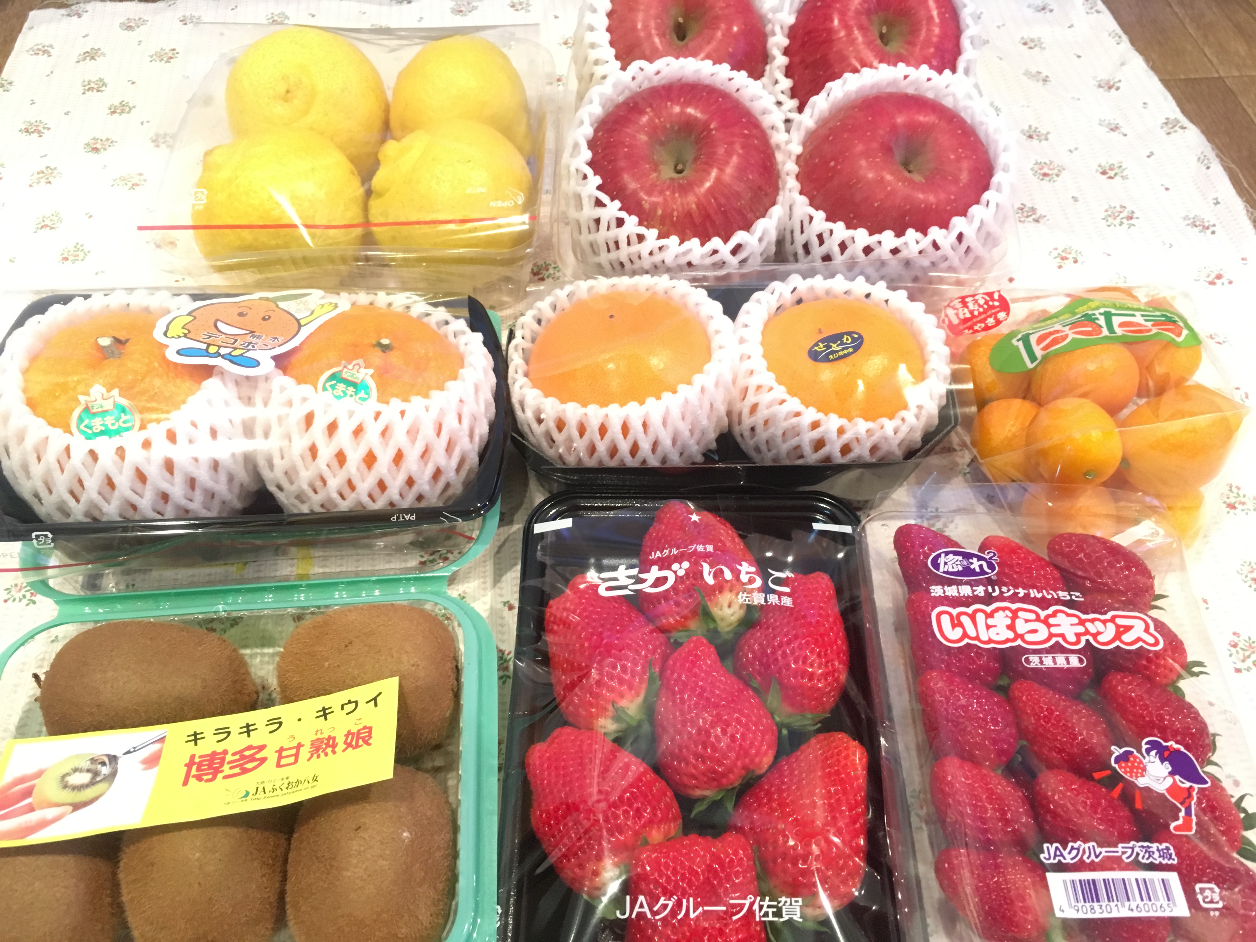 いちご「佐賀i9号」佐賀県産・「いばらキッス」(茨城県産)・黄色いけれど酸味はまろやか、はるか(長崎県産)・濃厚な甘みのデコポン(熊本県産)・果汁たっぷりジューシーな せとか(愛媛県産)・完熟金柑「たまたま」(宮崎県産)・サンふじりんご(青森県産)・キウイフルーツ(福岡県産)