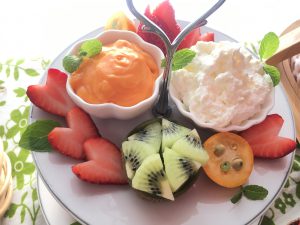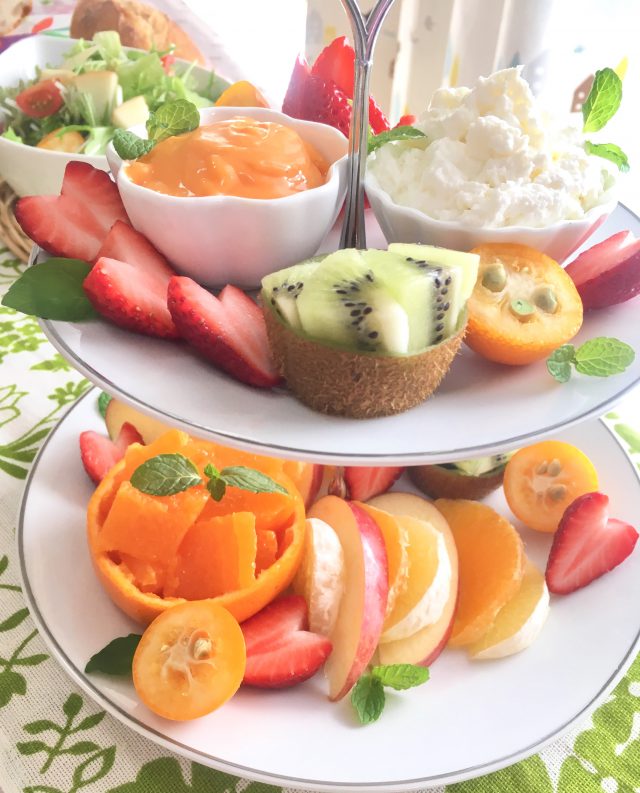 今が旬の、一番おいしい産地から厳選された果物たちが勢ぞろい。なんて贅沢なんでしょう。幸せフルーツボックスを総動員して、お気に入りのケーキスタンドに盛り付けました。