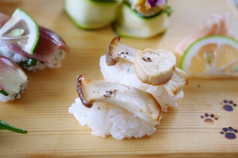 夏野菜をふんだんに使ったにぎり寿司。野菜の味を残しつつ、それぞれ味を変えて作ってみました。