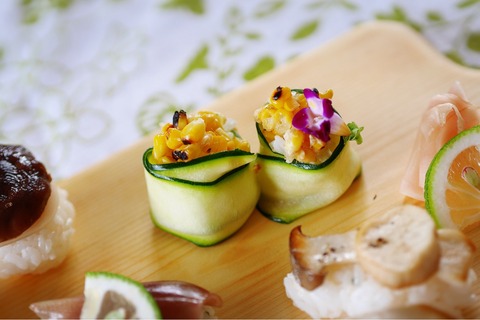くるくるズッキーニの軍艦には焼きトウモロコシをトッピング。夏の香り。それぞれの野菜に味をつけて野菜の味や食感を損なわないようにしました。