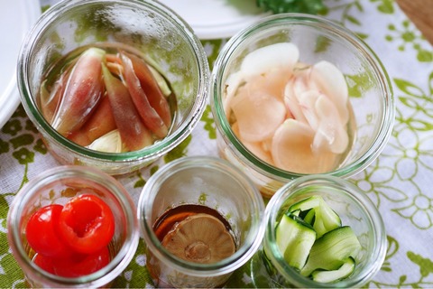 ミョウガと新生姜を甘酢につけました。プチトマトはオリーブオイルビネガーにマリネ。しいたけは甘辛く煮付け。ズッキーニ ハーブソルトでしんなり。