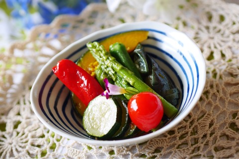 野菜を油でさっと揚げて和風のお出しに漬け込んで冷蔵庫で冷やします。
