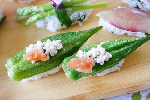 パプリカやオクラは野菜のにぎり寿司に使いました。鮮やかな彩りです。