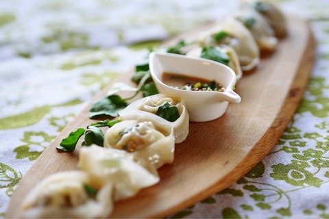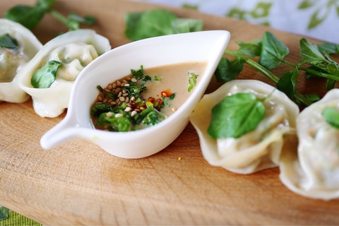 餃子の形を帽子のように丸く作ります。帽子のつばのように見えるのでハット餃子。ゴマダレに刻みクレソン。ラー油をたらしていただきます。クレソンの香りが爽やかな餃子になりました。