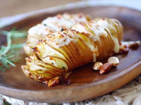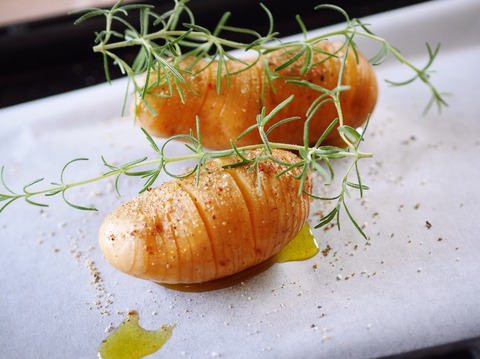 スウェーデンのじゃがいも料理です。形が細長くて 切れ目が綺麗に開く、型崩れの少ないメークインを選んで作りました。切れ目が開くところからアコーディオンポテトとも言うそうです。