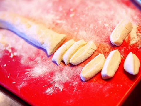 サトイモはよく洗い、皮付きのままボイルします。サトイモ400グラムに対して、薄力粉150グラムを加減をみながら混ぜて形を整えて。丸めて長くカットしたサトイモニョッキを茹でるだけ。