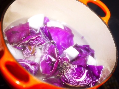 紫キャベツ4分の1と玉ねぎ半分が浸るくらいの水約150㏄にコンソメ1個を入れて柔らかくなるまで煮ます。ブレンダーやミキサーなどでピューレにします。柔かくなったら牛乳100㏄を加えて(キャベツの量にあわせて)仕上げに生クリームを回し入れて塩コショウで味を整えて出来上がり。