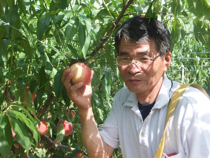 「直売所ではお客さんのニーズで旬の時期が異なる品種をすこしずつ長く販売して行こうと思った」と言う。「気になる品種を植えていたら、どんどん増えていった」と藤渕さんは笑う。苗木は主に山形から取り寄せていると言う。近年、新しく挑戦した桃も多く、これからの時期、「川中島白桃」と「ゆうぞら」を掛け合わせた「玉うさぎ」や野池白桃の枝替わりの「紅錦香」が初めての収穫となると言う。収穫までの苦労が多い果樹栽培。「今年は花の時期にヒョウが降って受粉も悪く花がかなり傷みました。やっと実がついて来たと喜んでいると、実が青いうちにハクビシンや、タヌキ、アナグマに食べられてしまってため息が出た」と肩を落とす。それでも、後を継いでくれる息子さんやその友人、奥様と4人で力を合わせ収穫の時期が一番忙しくもあり楽しいと言う。DSCF4448