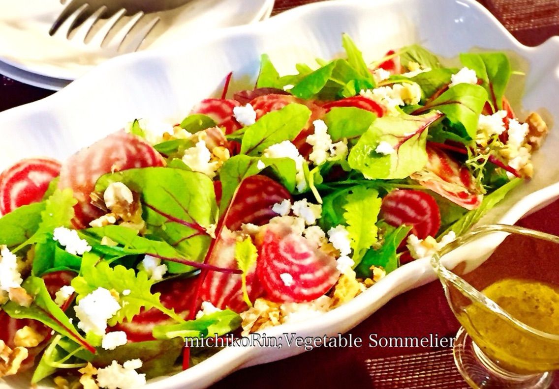 ビーツには渦巻き状の模様が 入っている品種もあります。こちらは模様を活かしてスライスし、 ベビーリーフ、カッテージチーズ、 くるみと組み合わせてサラダに。