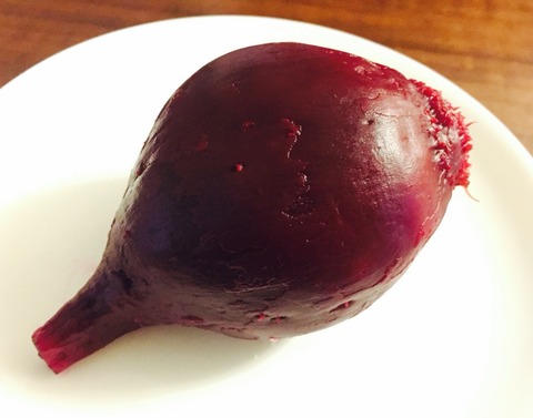 肥大した根は深い赤紫色で 形はカブのように見えますが ホウレンソウと同じアカザ科の 野菜なんですよ。 ホウレンソウの根元の赤い部分と似た味がしますので食べてみると納得ですね。砂糖の原料となるテンサイの仲間とあって、独特の甘みも特徴です。ビーツは、皮つきのまま竹串が通るくらいに茹でて、そのまま冷ますと下の写真のように皮がつるんと剥けます。