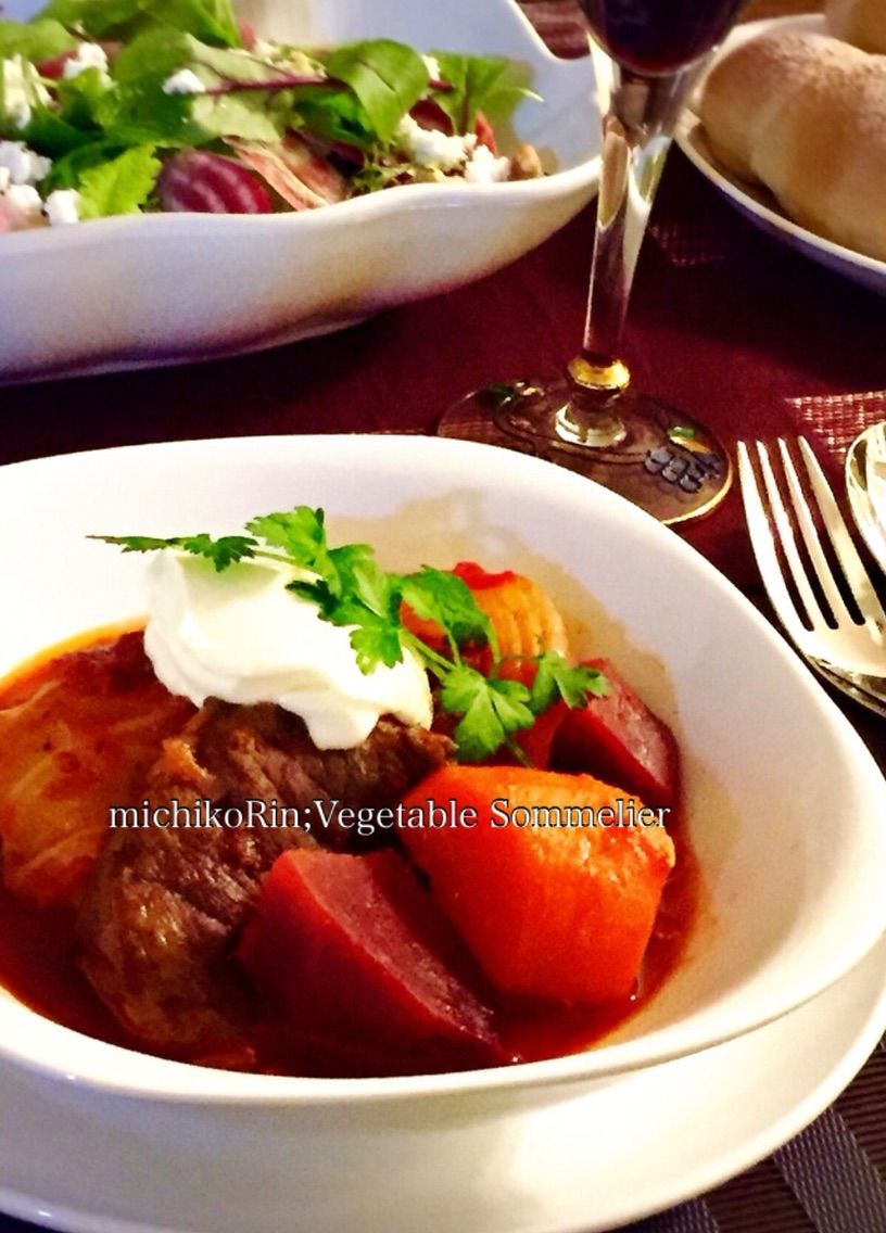 そして、ビーツと言えば ロシアの伝統料理ボルシチですね。牛肉、ビーツ、にんじん、玉ねぎ、 キャベツ、セロリ、トマトなどを 赤ワインを加えじっくり煮込んで、 サワークリームを添えていただきます。 深みがある赤い色と旨味が 体も心も温めてくれますね。