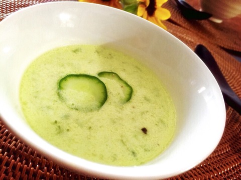 お鍋にココナッツミルクと 摩り下ろしたキュウリを入れて温めコンソメ、カレー粉、塩胡椒ほかお好みのスパイスで味を調える。仕上げに輪切りキュウリをトッピング。夏になると飲みたくなるアジアンテイストのスープです。