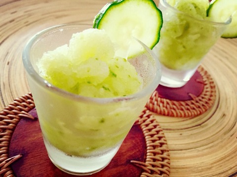 摩り下ろしたキュウリとグレープフルーツの果肉とハチミツをミキサーで撹拌してジップロックなどに入れ冷凍する。食べる時に輪切りのキュウリを飾る。シャリシャリ感がたまりません!さっぱりとお口直しやデザートにおすすめですよ。キュウリは殆どが水分ですが余分なナトリウムを排出するカリウム他ビタミンCなどを含んでいます。切り方や調理法によってバリエーションも広がりますね。キュウリが主役のお料理いろいろお楽しみいただけましたら幸せです。
