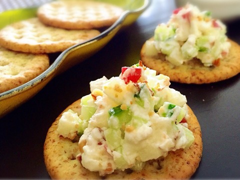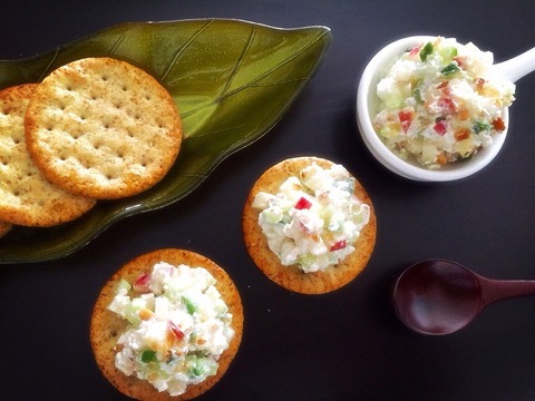 小さく角切りにしたキュウリとリンゴ クリームチーズと刻んだアーモンドを ミックスしてクラッカーにのせます。ワインにとても合う簡単オードブル。