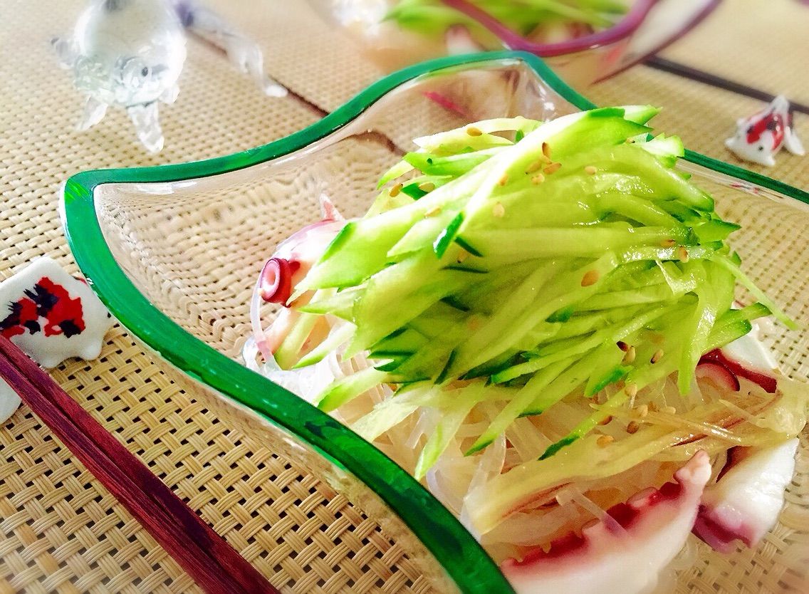 キュウリは千切りに。茹でて戻しておいた春雨とタコと千切りミョウガと梅干しの梅肉の叩きを混ぜて器に盛り、キュウリをのせて白だしをベースに作って冷やしておいたつゆをかけ白ゴマをトッピング。冷麺風のあっさりヘルシーメニュー。