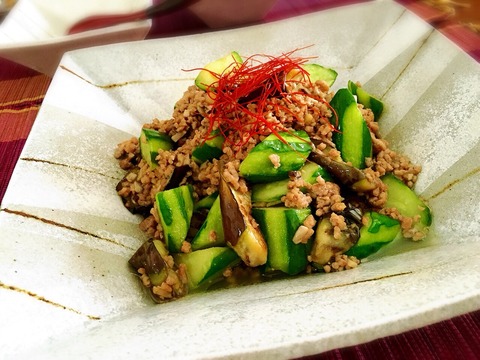 キュウリとナスは乱切りに。熱した中華鍋にごま油をひきナスを炒め取り出しておく。次にみじん切りのショウガとシイタケと豚挽き肉を炒めキュウリも加え更に炒めてオイスターソース、豆板醤を加え全体に火が通ったらナスを戻し水溶き片栗粉でとろみを付ける。仕上げに糸唐辛子をトッピング。キュウリでヘルシーにピリ辛で食欲アップの一品です。