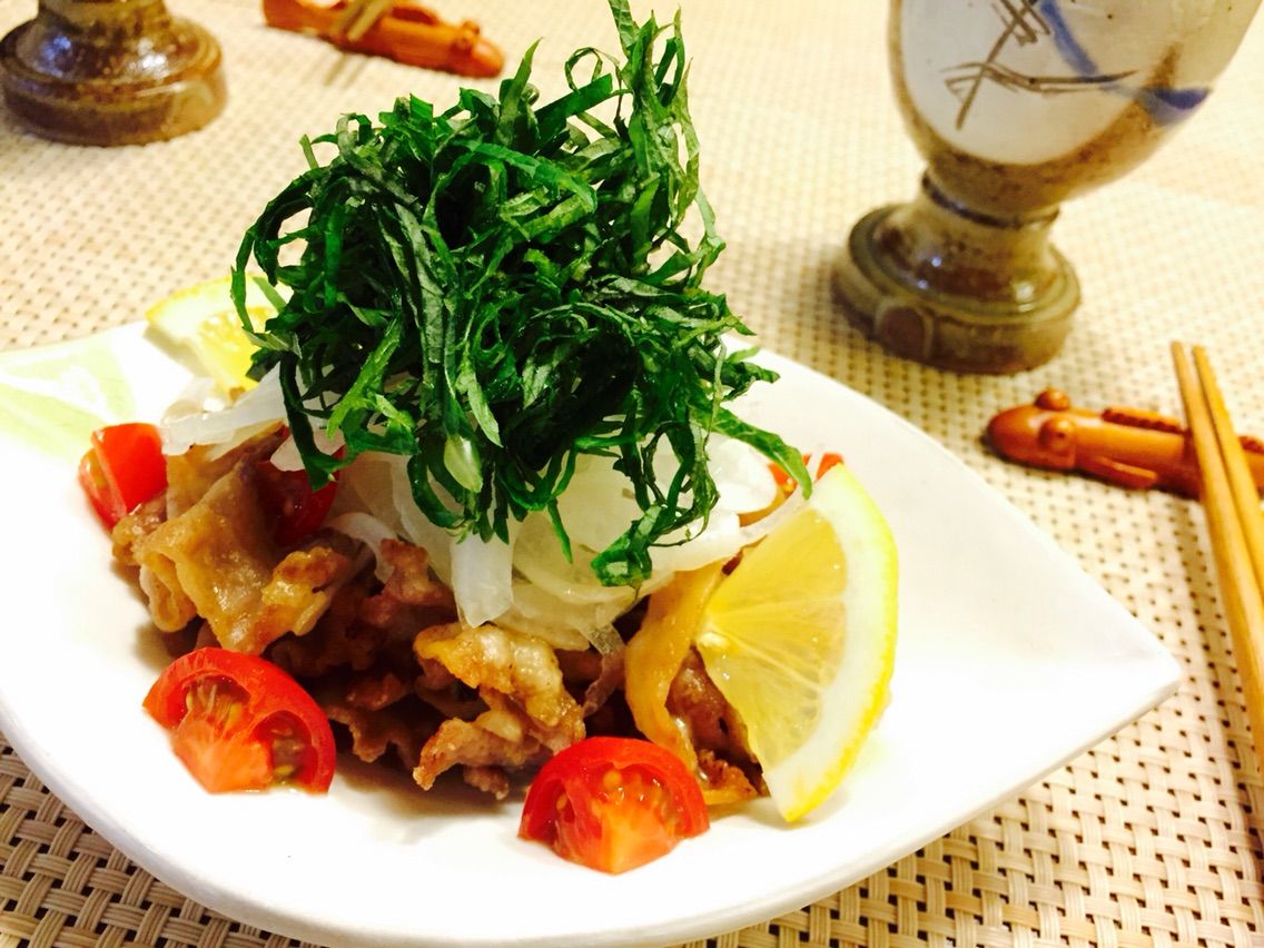 カットした豚バラ肉をカリカリになる直前ぐらいまでフライパンで焼き新玉ねぎ、フルーツトマトとたっぷりの千切り大葉を一緒に盛り、レモン果汁やポン酢をかけていただく。大葉は千切りにすることで香りが増し食欲を増進させてくれます。 豚バラ肉の焼き加減がポイントで 熱々でも冷めても美味しく 大葉が沢山食べられるサラダです。 鉄分も多く含む大葉は、その吸収を 助けるビタミンCを含む野菜と一緒に摂取すると貧血予防にも効果的ですね!