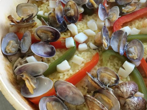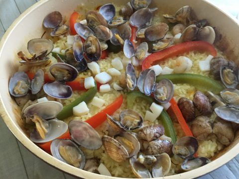 米2合、あさり150g、シーフードミックス120g、パプリカ(赤と緑)各1/4個、玉ねぎ1/2個、マッシュルーム4個、ニンニク2片。そして忘れてはいけないサフラン0.2g。ほんのわずかですが、とてもいい仕事をしてくれます。