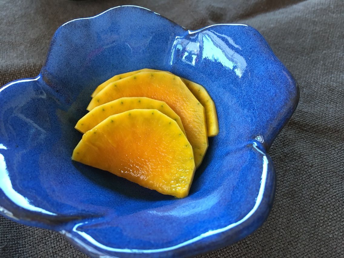 甘酢漬けは、硬い柿のような食感です。