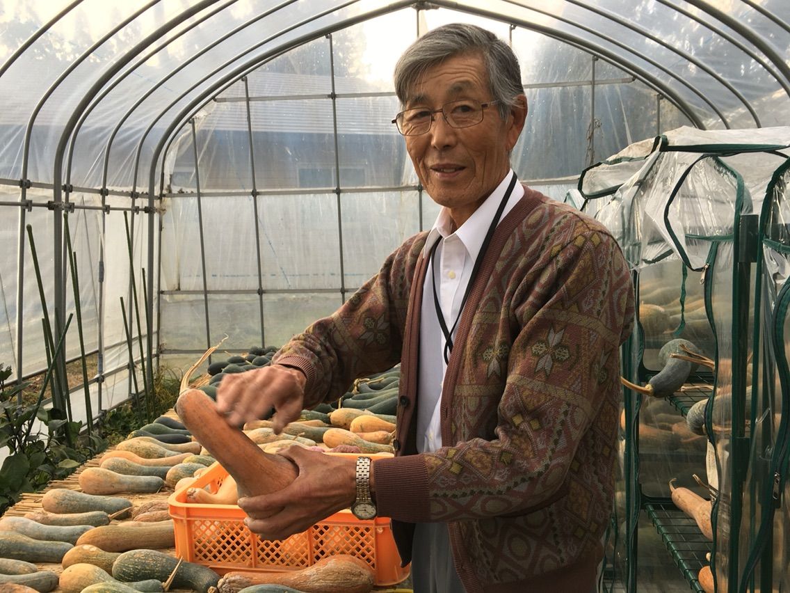 在来の鶴首カボチャの種を譲り受けたという横田一郎さんに