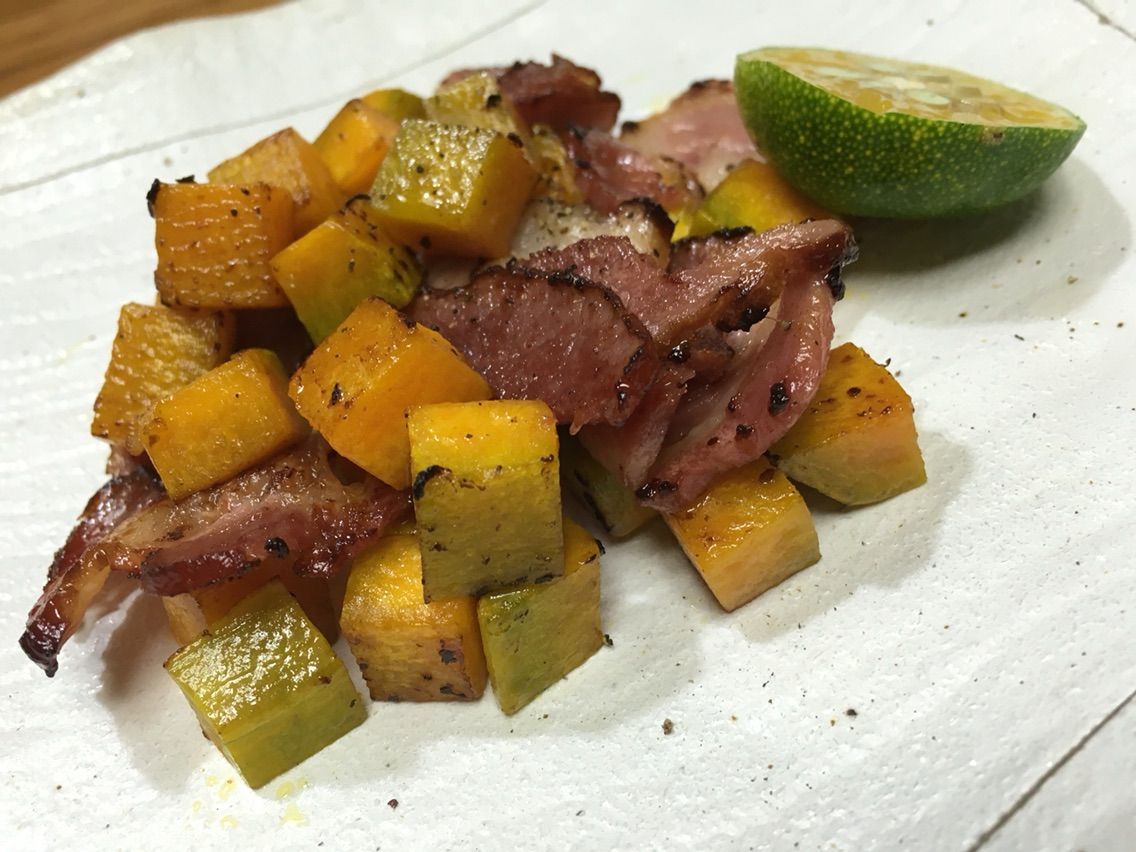 サイコロ状に切ったカボチャとベーコンの炒め物は