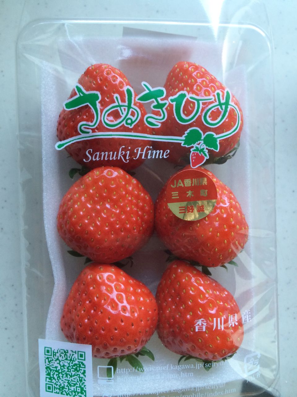 香川県オリジナル品種で、たくさんの人にかわいがってもらいたいと、想いをこめて名づけられたそうです。柔らかくてふんわりと甘い。バランスがいいですね~。あまおうと並べると、大きさがわかりませんが少しおおきめですよ。甘さは負けないほど。そしてとてもジューシー!出荷期間が長いのも特徴です。こちらも、とても美しいですね。