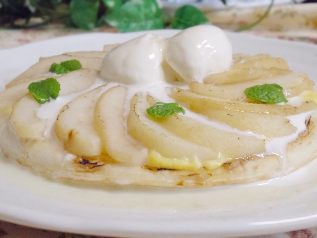 香り高くてとろける甘さの洋なしはカスタードクリームの上に並べて焼きたて熱々のうちにアイスクリームを添えました。洋なしはチーズとも相性が良いので洋なしとチーズをのせて焼いてもおすすめですよ。