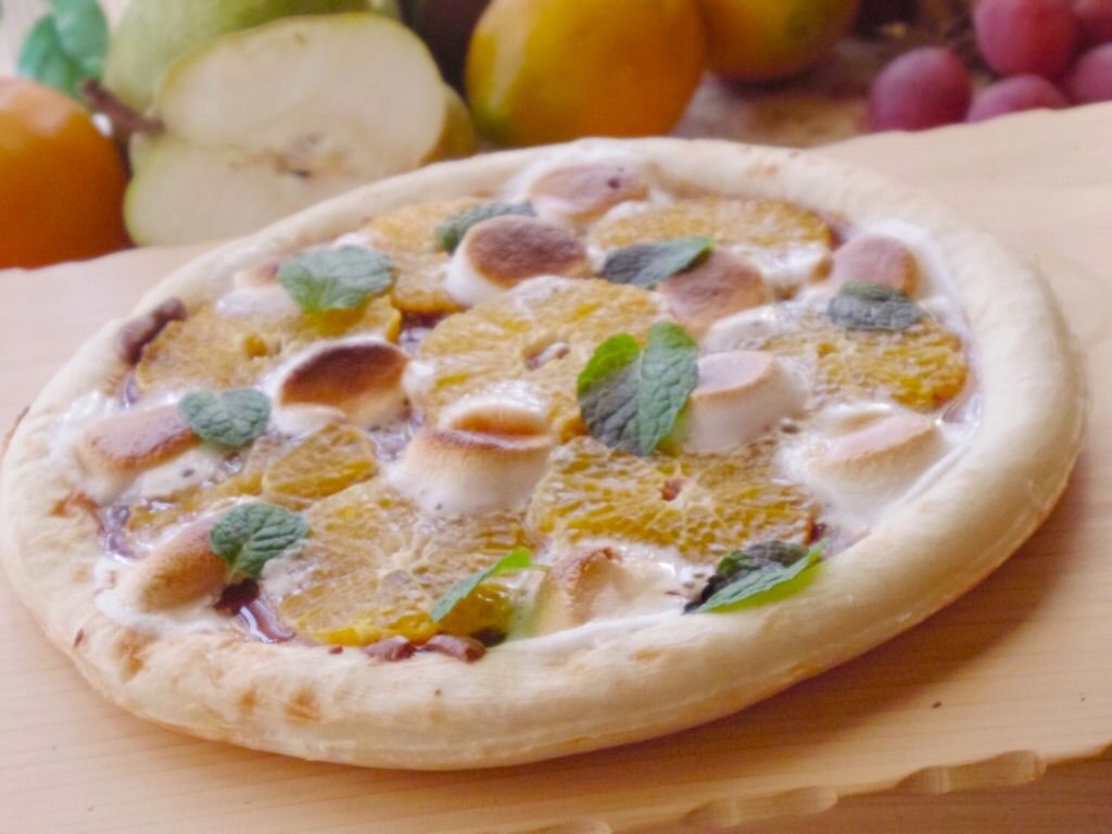 ブランデーが香るみかんとチョコレートは相性ばっちり!こんがり焼けたマシュマロがとろける甘~いピッツァです。