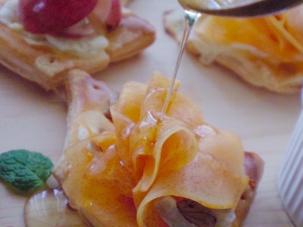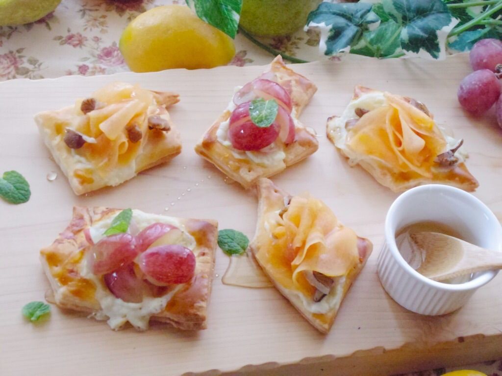 そして、こちらはピザではないですが、冷凍パイ生地を使ったデザート。凍ったままのパイ生地を適当にパリパリと割ってクリームチーズをのせたら卵黄を塗ってオーブンへ。カットした葡萄とスライサーを使ってヒラヒラにした柿や胡桃をのせました。