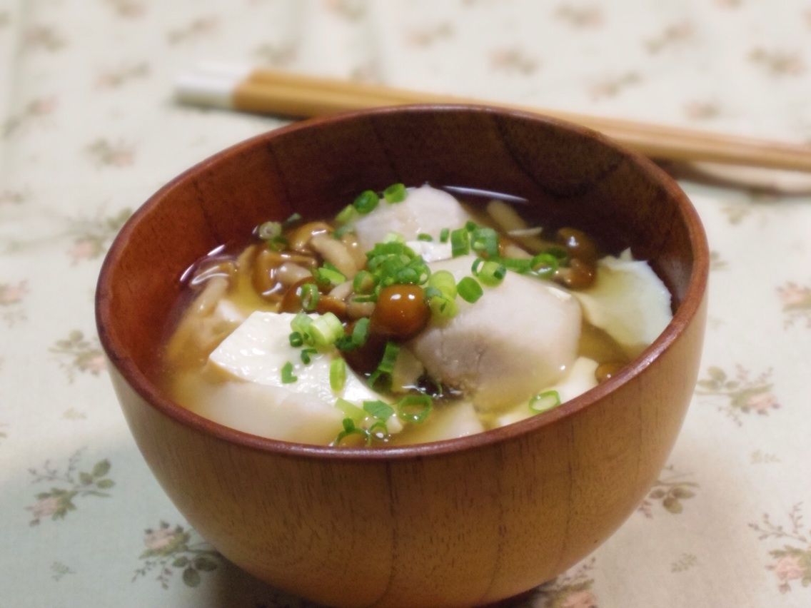 里芋となめたけで とろみをつけたお吸い物 ソフト豆腐の柔らかい くずし豆腐を入れました。 やさしいお出汁で美味しかったです。もう少し寒くなったら 柚子の皮を入れても美味しそうですね。