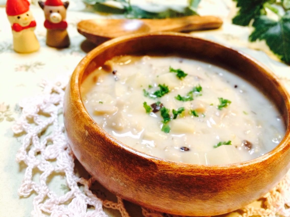刻んだお野菜と雑穀をコンソメスープで柔らかくなるまでコトコト煮て、牛乳と塩胡椒とバターも少々