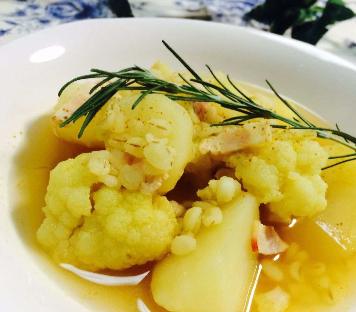 カレー風味のコンソメスープでスパイシーに。プチプチ大麦とゴロゴロ カリフラワーとじゃがいもで自然とよく噛むため、満腹感がいっぱい。カリフラワーもじゃがいもも加熱によるビタミンCの損失が少ないのでスープにしてもたっぷり摂取できますね。
