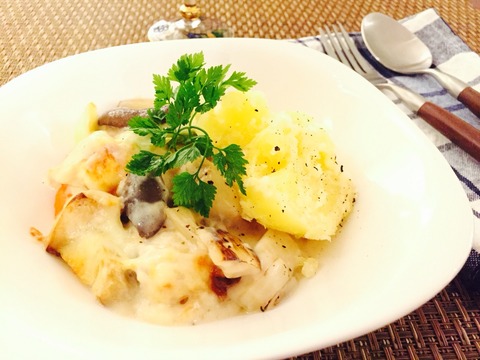 エリンギとホタテと長ネギを炒め、ホワイトソースで煮込んで、ジャガイモの粉ふきいもを添えて。エリンギは形が崩れないので、煮込み料理に向いています。コリコリしたエリンギの食感で、美味しさが増す一品です♪