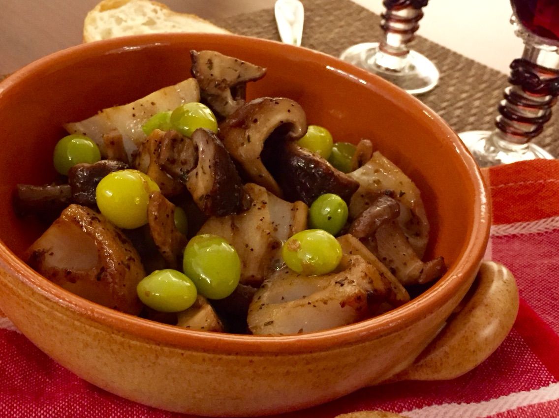 にんにくと蓮根をオリーブオイルでじっくり炒めて、生しいたけと銀杏を加え更に炒めて、塩とブラックペッパーで味を調えてできあがり。肉厚の生しいたけの旨味ともっちりとした蓮根の食感と銀杏のほのかな苦味がとても合います。バケットを添えていただきましょう♪