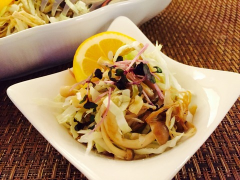 にんにくのみじん切り、えのき茸、ぶなしめじをオリーブオイルで炒めて、塩とブラックペッパーで味を調え、カットしたキャベツとさっくり和えてレモンを絞っていただきます。ドレッシングいらずのヘルシーなおかずサラダ。キャベツを沢山食べたい時にもおすすめです♪