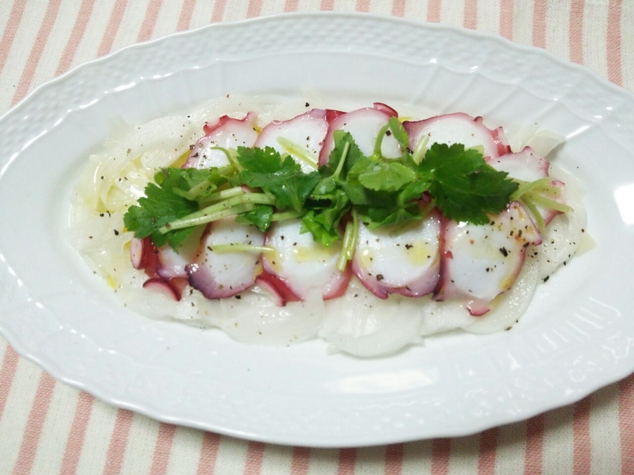 そのまま、かつおぶしと醤油で食べてもいいですが、いろいろアレンジもできますよ。タコと一緒に並べてオリーブオイルをかければオシャレな前菜に。