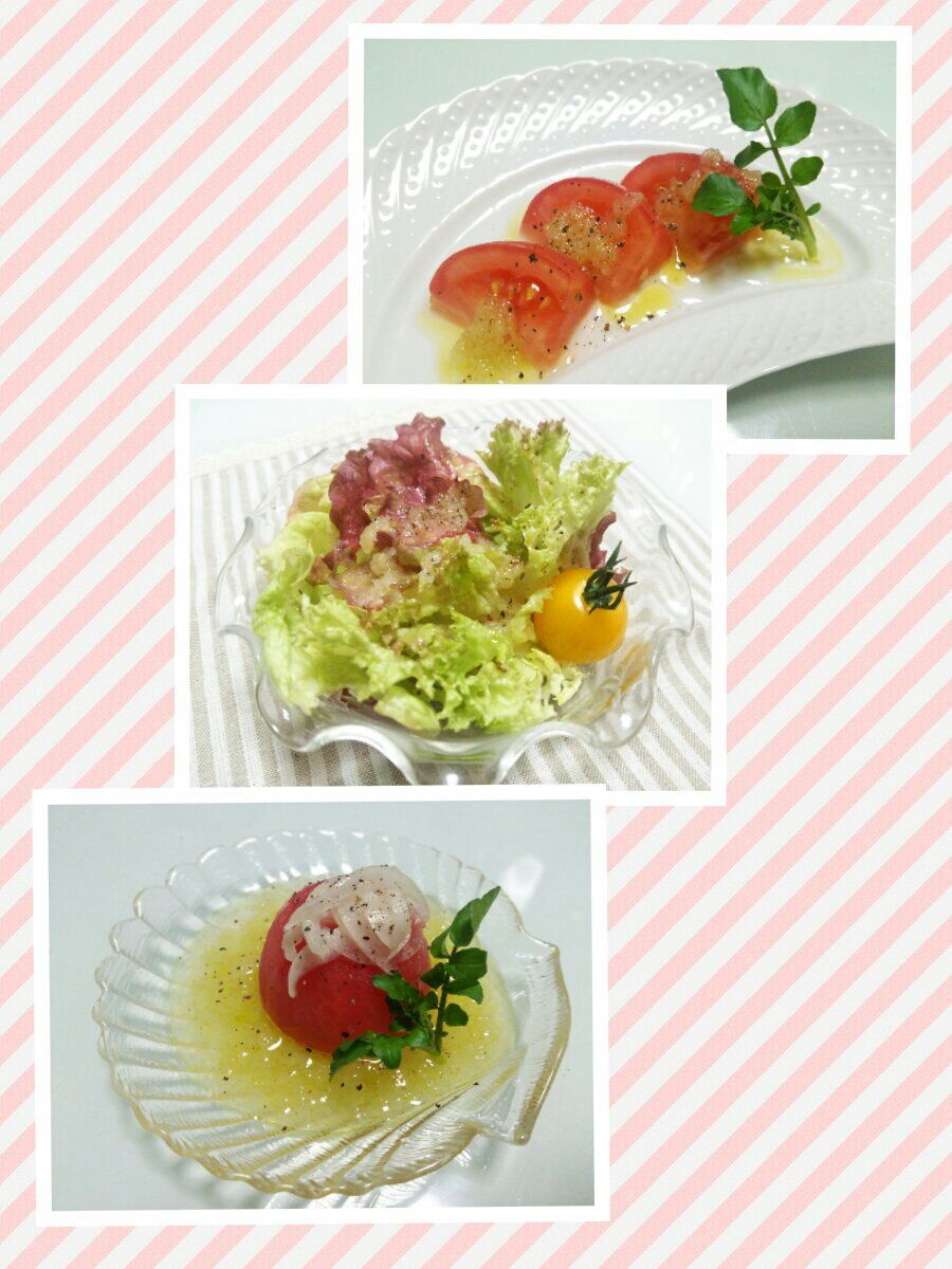 ボウルに酢、塩、こしょうを入れて混ぜ、お好みのオイルを加えて、ホイッパーでよく混ぜ合わせ、新玉ねぎのすりおろしを加えれば出来上がり。蓋付きのビンに入れて振れば簡単にでき、1週間程度ならそのまま保存も出来ますよ。シンプルにカットしたトマトやレタスのサラダに。