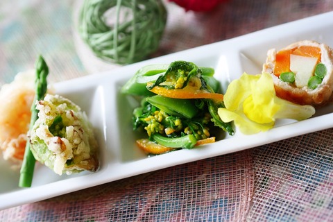 お店に春を探しに行って参りました。旬の春野菜を使ってお花見御膳のご紹介です。
