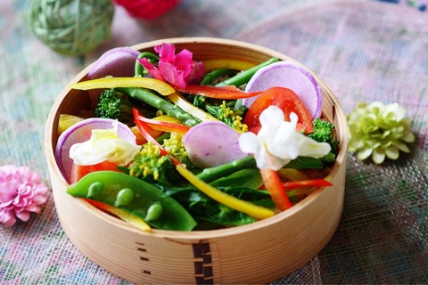 白いご飯に甘辛く入り煮した鶏そぼろを混ぜ合わせ、わっぱのお弁当箱に敷き詰めました。鶏そぼろご飯の上には 菜花、ブロッコリー、アスパラガス、スナップエンドウ、パプリカ、紫大根、プチトマト、食べれるお花エディブル・フラワーを散りばめました。赤や黄色 紫 緑、色とりどりなカラーがまるでお花畑みたいになりました。