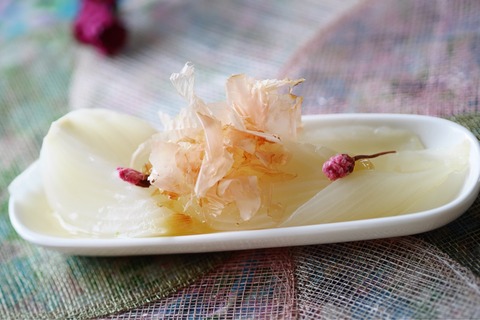 優しい風味のアゴだしで コトコト。新玉ねぎ丸ごと煮含めました。 柔らかく甘い新玉ねぎが春の風を運んできました。春の玉ねぎは普通の玉ねぎより水分が多く、辛みが少ない、瑞々しい甘みの強い玉ねぎです。玉ねぎの栄養素の一つ、イオウ化合物は血液サラサラ効果があると言われていますが、水に溶けやすいため、玉ねぎをスライスしてすぐに水にさらすと、イオウ化合物が溶け出してしまいます。