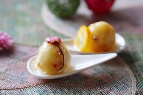 新じゃがを熱いうちにマッシュして、片栗粉 みじん切りにした桜の塩漬けを混ぜこみ、丸めて片栗粉をつけて、サラダ油で揚げました。きんかんたまたまを餡に絡めて、新じゃが餅にかけました。お出汁に爽やかな柑橘の香り。桜の香りと柑橘の爽やかさ、二度おいしい新じゃが餅になりました。桜の花びらで春らしく。