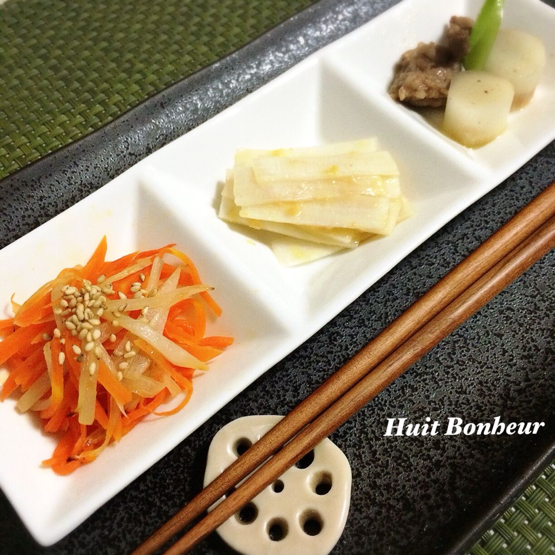今日は栃木県産の「那須の春香うど」で3品のプレートを作りました。まず左から、うどと人参のきんぴら、中央、定番うどの酢味噌和え!そして右は牛肉うど煮込みにスナップエンドウを添えて。