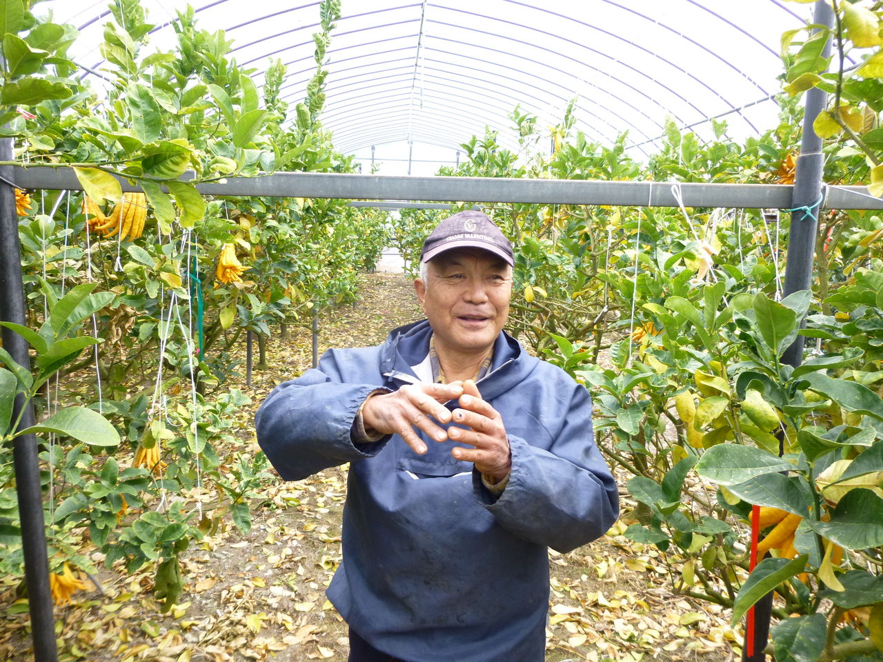 仏手柑は11月から2月の間に出荷時期を迎えます。60本ある木には、それぞれ50個程が実り、1シーズンで約3000個が収穫されています。全国の仏手柑の約3分の1がここにあるんですね。