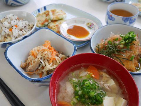 手前の「豚汁」は、昆布といりこでとっただしに加えて、シイタケの戻し汁を1人当たり大さじ1加えます。だしがしっかりきいているので味噌は控えめに。