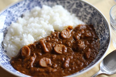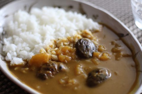 右は「ナシータカレー」。鳥取特産の二十世紀梨と原木乾シイタケのカレーです。シイタケが丸ごとゴロっと入っていてインパクト大。肉厚シイタケのぷりっとした食感、歯ごたえがあります。シイタケと梨、初めての組み合わせでした。