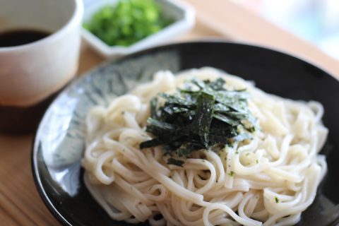 左は「のど越しつるつるうどん」。麺に鳥取県産原木乾シイタケの粉末が練りこんであり、茶色がかっています。昆布とかつおでとっただしを使ってつゆを作りましたが、これにもシイタケの戻し汁を入れました。うどんは名前の通りの“のどごしつるつる”でした。