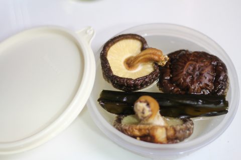 乾シイタケのうまみを引き出すには、戻し方にコツがあります。乾燥した状態で数分間水に浸し、表面の汚れを取ります。乾燥した状態からそのまますぐに水に浸けて戻さないようにします。水を替えて、きれいな水と洗った乾シイタケ、昆布1切れを一緒に入れて冷蔵庫でじっくり時間をかけて戻します。昆布のグルタミン酸とシイタケのグアニル酸の異なるうまみ成分の相乗効果で戻し汁がぐっとおいしくなります。