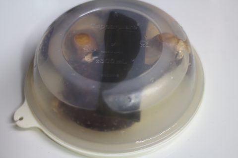 私はこのような密閉できる蓋つきの保存容器(水漏れしないもの)に入れ、時々容器を逆さまにして向きを変えながら冷蔵庫で半日かけて戻します。