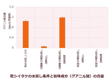 冷蔵庫でゆっくり水戻しした後、さらに60~70℃の温度で加熱するとうま味と香りが増します。時間がないからと、ぬるま湯で戻したりすると苦みやえぐみの成分が生成され、うまみのもととなる成分が減ってしまいます。